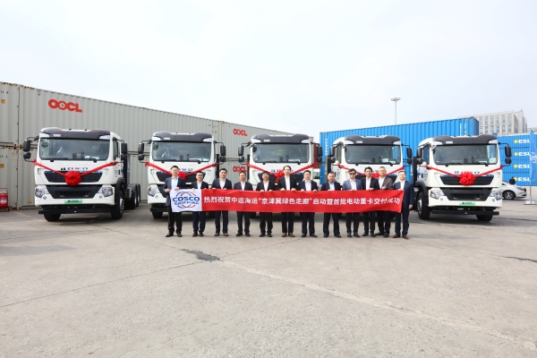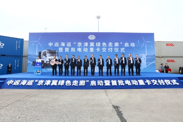 10月16日,中远海运集团华北区域总部/中远海运(天津)有限公司联合中远海运集装箱运输有限公司、中远海运物流供应链有限公司共同举办了“京津冀绿色走廊”启动暨首批电动重卡交付仪式。天津市交通运输委员会党委委员、一级巡视员、市港航管理局局长、党组书记王洪海,中远海运集团华北区域总部/中远海运(天津)有限公司董事、总经理、党委副书记吕欣,中远海运物流供应链有限公司总会计师、工会主席朱乐明,上海泛亚航运有限公司董事、总经理、党委副书记曾昭民,天津中远海运集装箱运输有限公司董事长、党委书记桂范峰,中远海运物流供应链(华北)区域公司董事长、党委书记刘东石,中国重型汽车集团有限公司卡车销售业务总监、卡车销售部党总支书记、总经理王军等出席仪式。