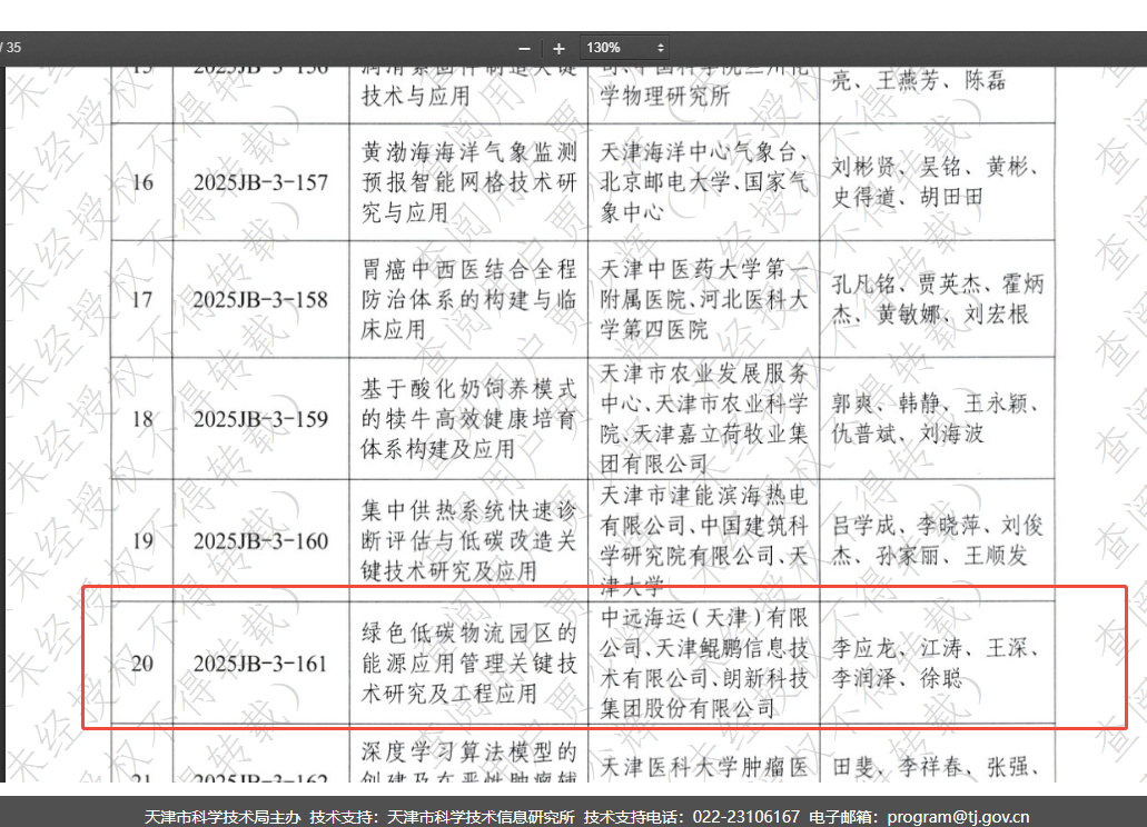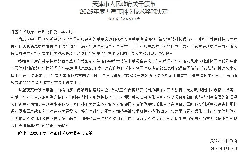 近日,天津市人民政府发布《关于颁布2025年度天津市科学技术奖的决定》(津政发〔2026〕7 号),正式公布2025年度天津市科学技术奖评审结果。由天津中远海运牵头完成的绿色低碳物流园区的能源应用管理关键技术研究及工程应用项目,凭借行业领先的技术创新成果、规模化的工程应用成效与突出的经济社会价值,成功斩获2025年度天津市科学技术进步奖三等奖。